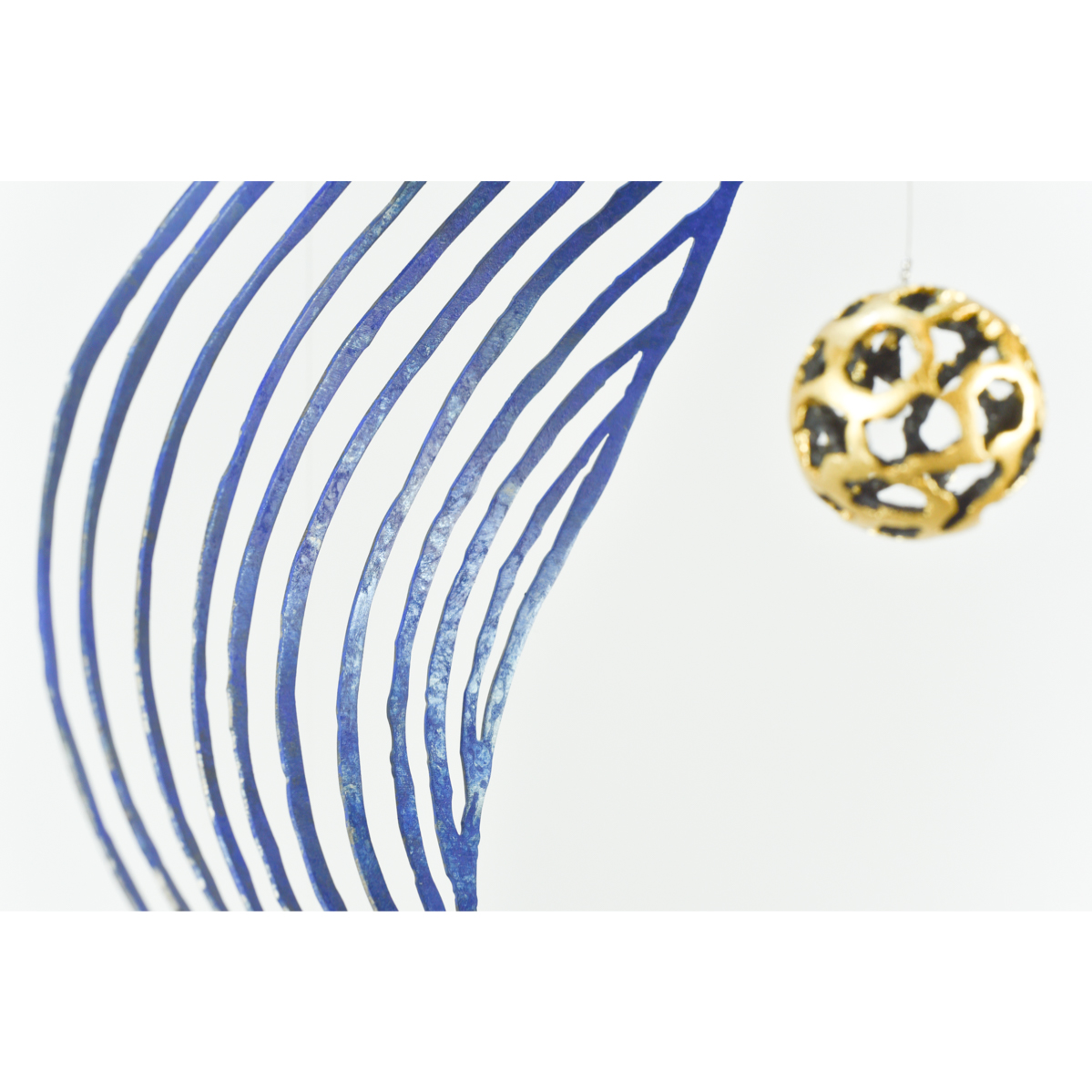 acier patiné, feuille à dorer, filin inox Dimensions : 50*15*64 cm