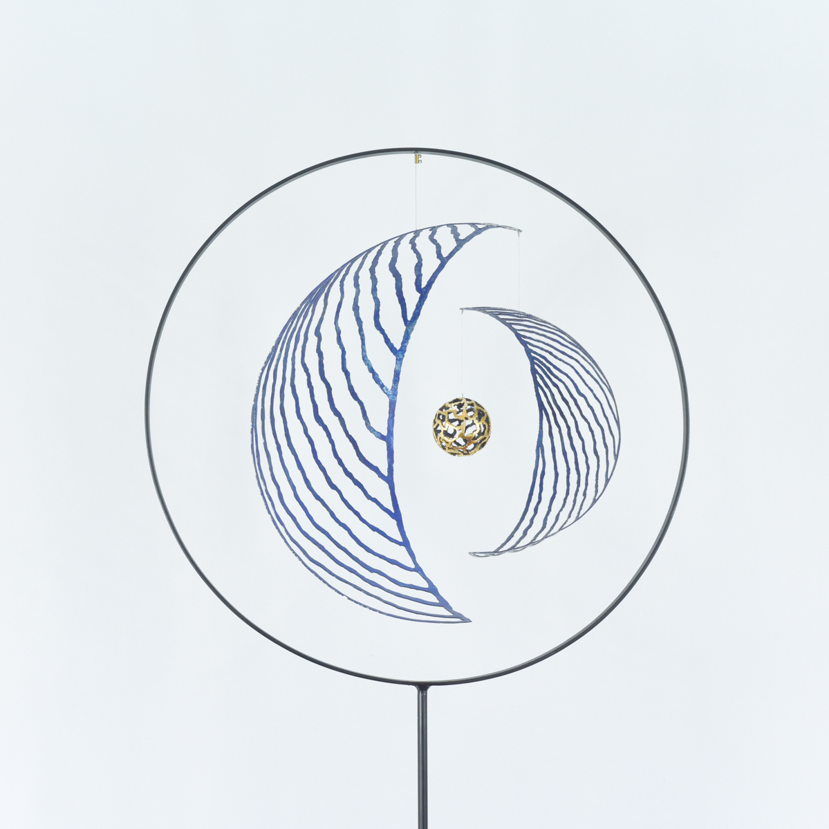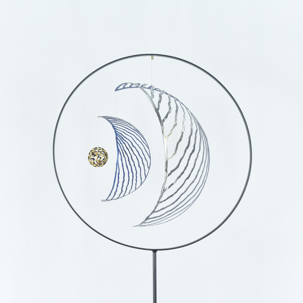 acier patiné, feuille à dorer, filin inox Dimensions: 209*57*37 cm